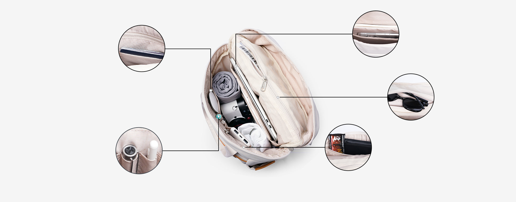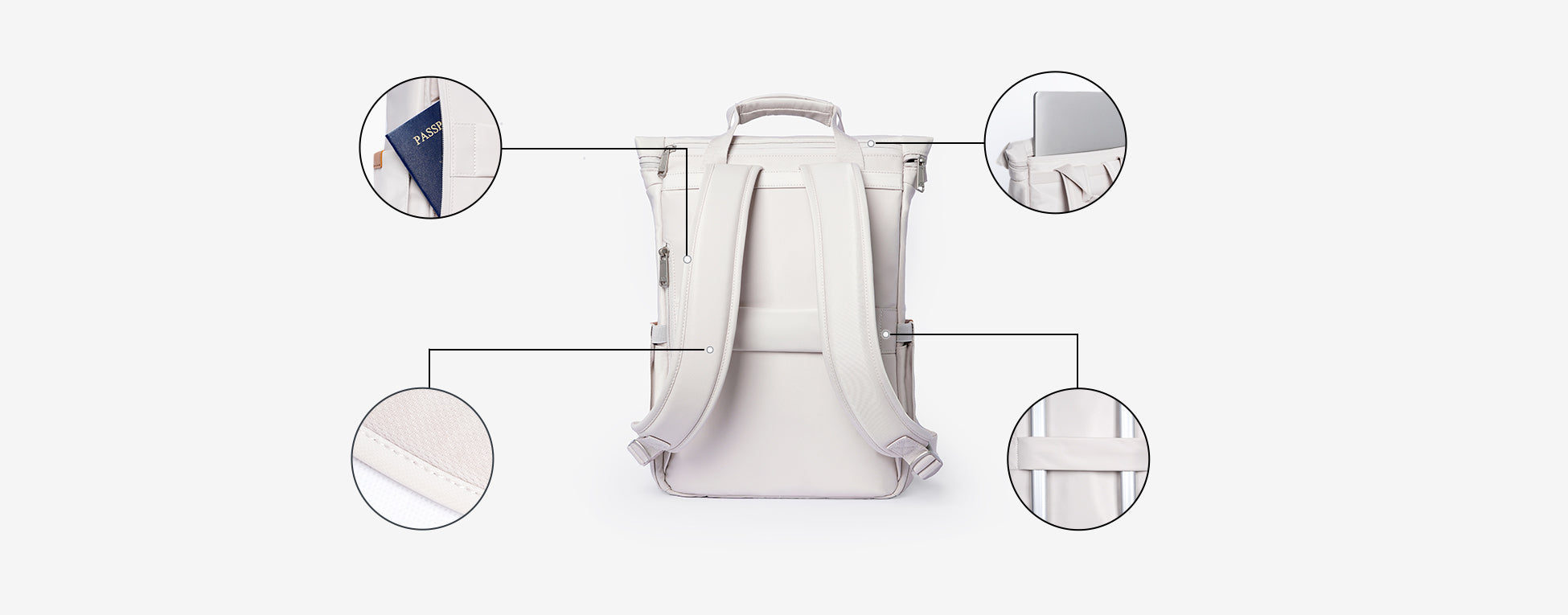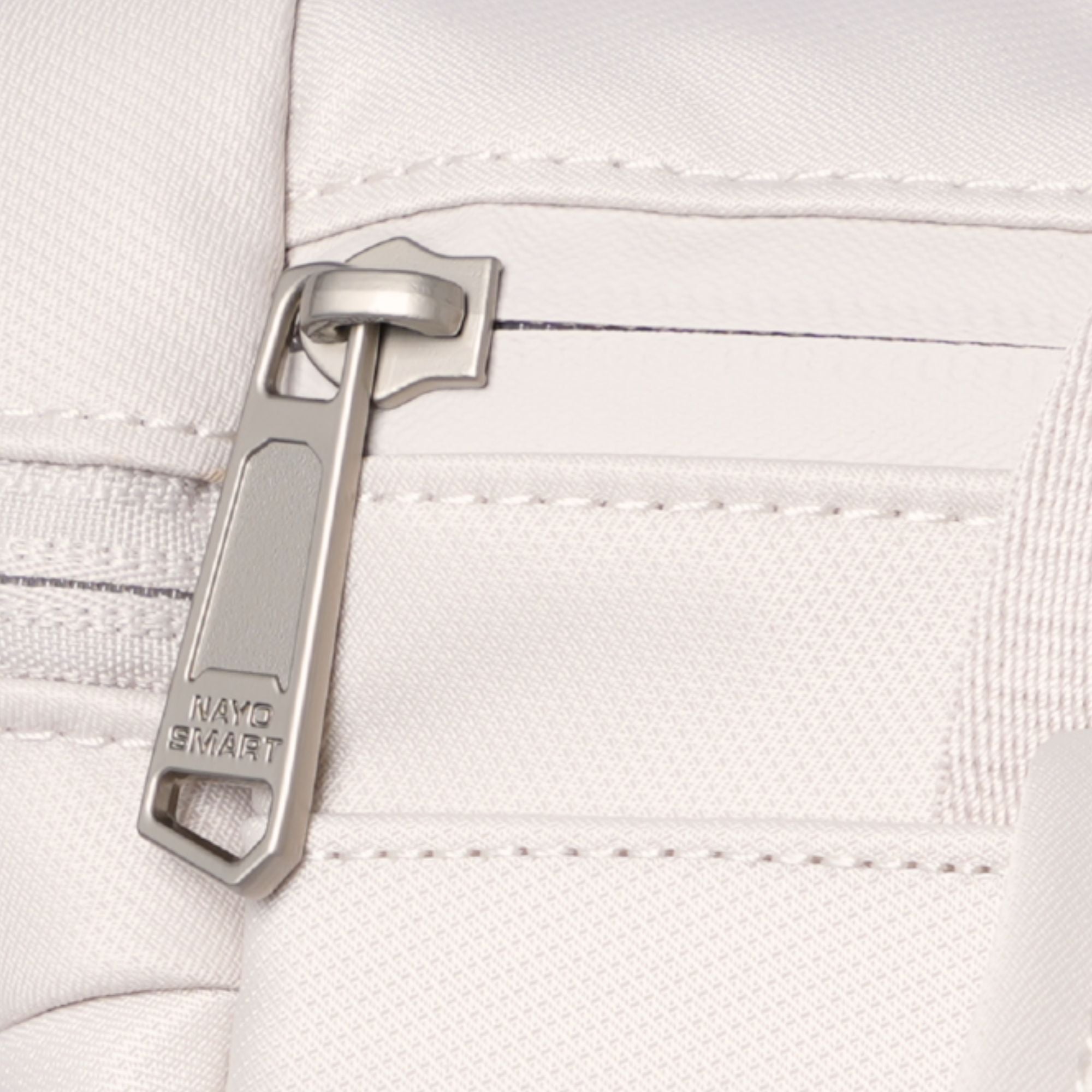 The exterior is made from water and stain-resistant 200D nylon mini-twill for easy cleaning, while the interior features 210T gray PU dots, offering a delicate, durable, lightweight, and eco-friendly design for comfort.