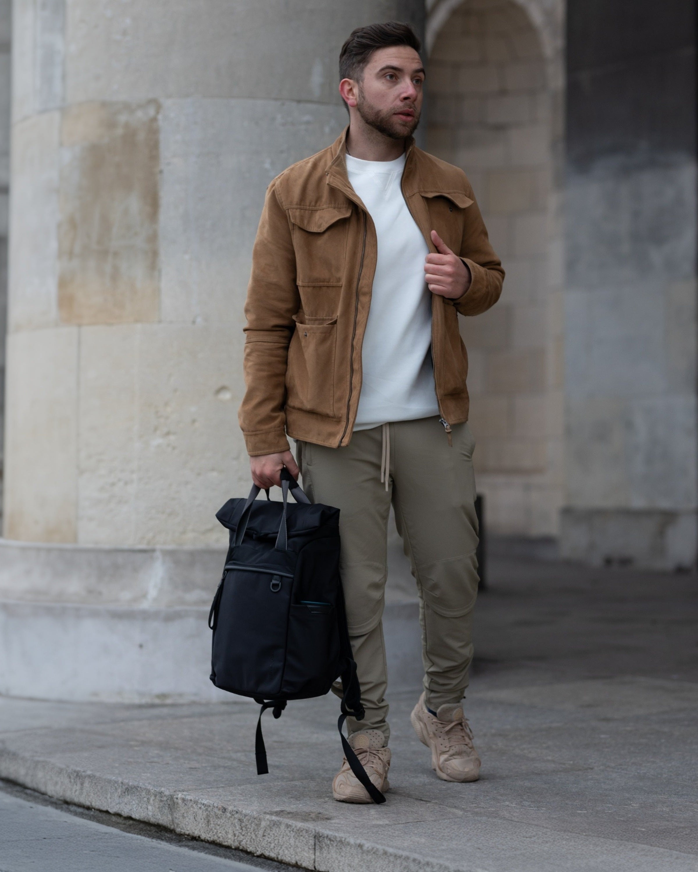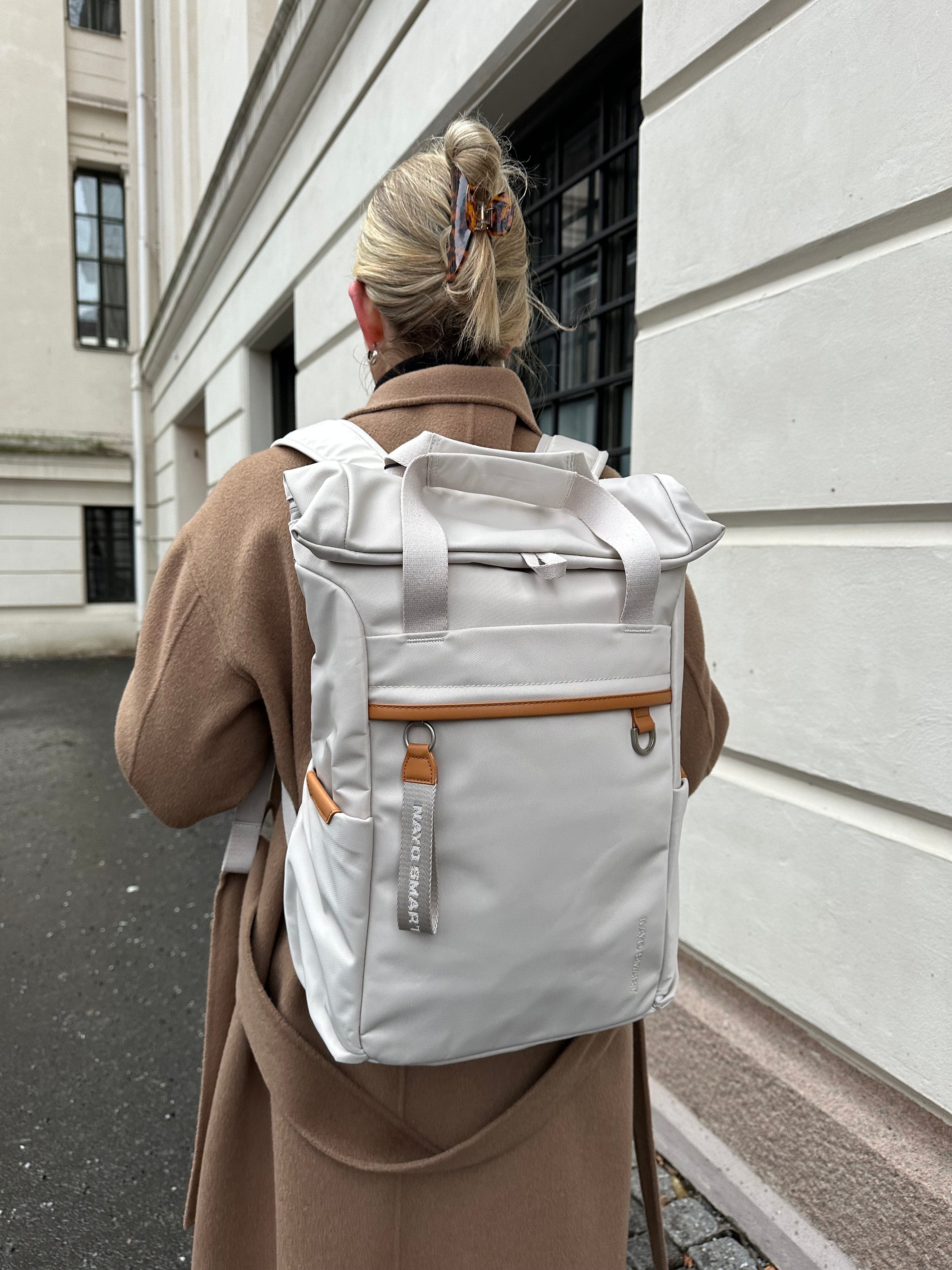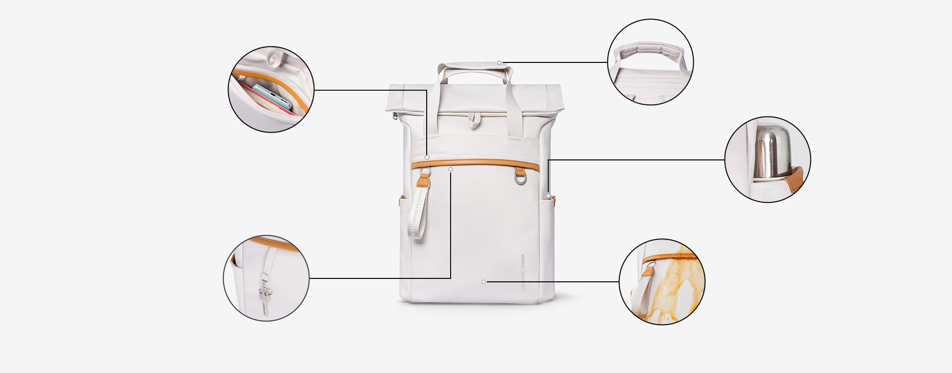 The exterior is made from water and stain-resistant 200D nylon mini-twill for easy cleaning, while the interior features 210T gray PU dots, offering a delicate, durable, lightweight, and eco-friendly design for comfort.