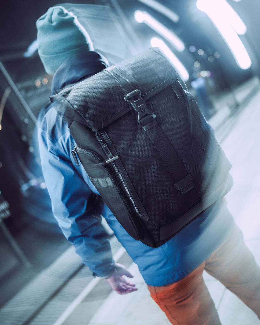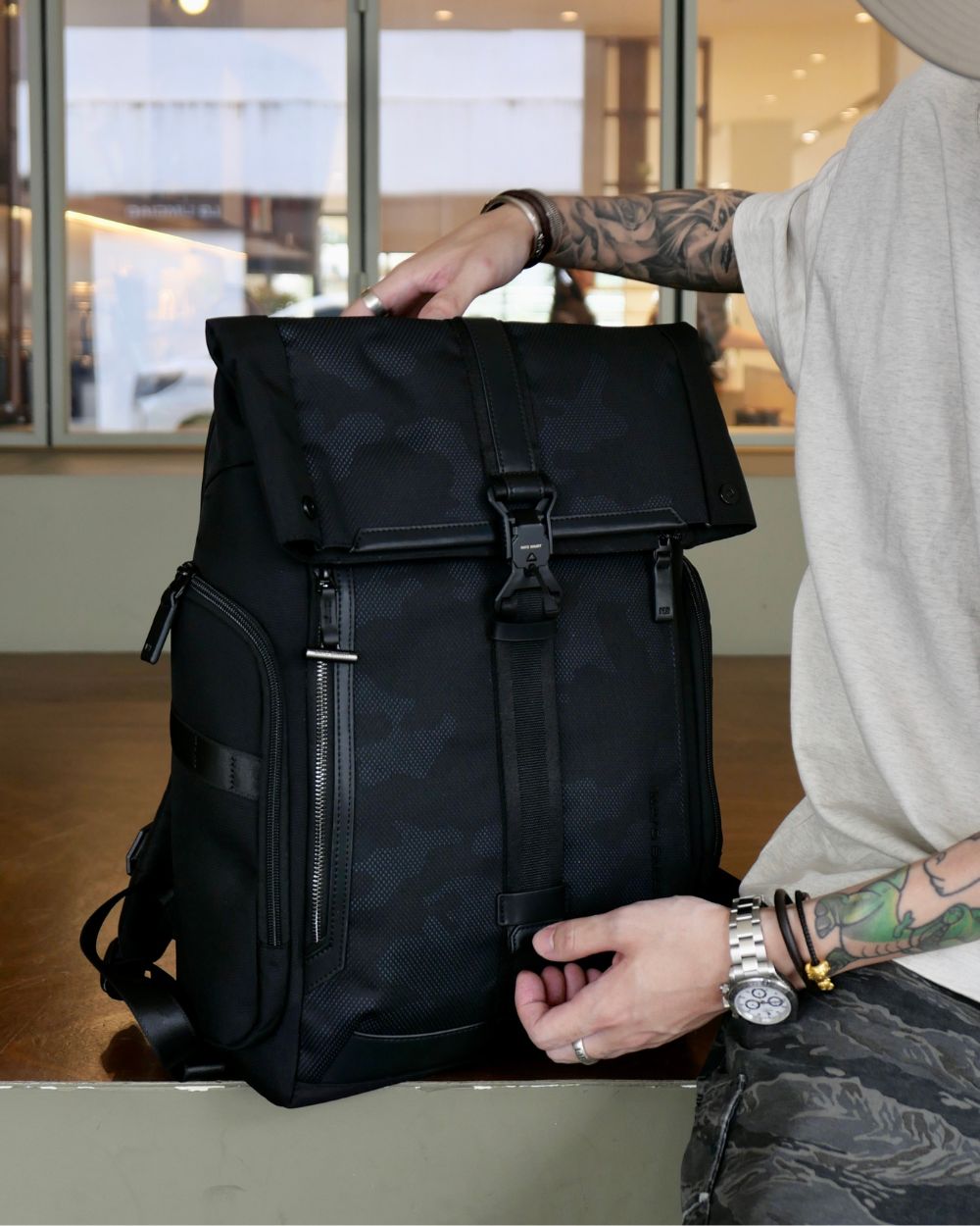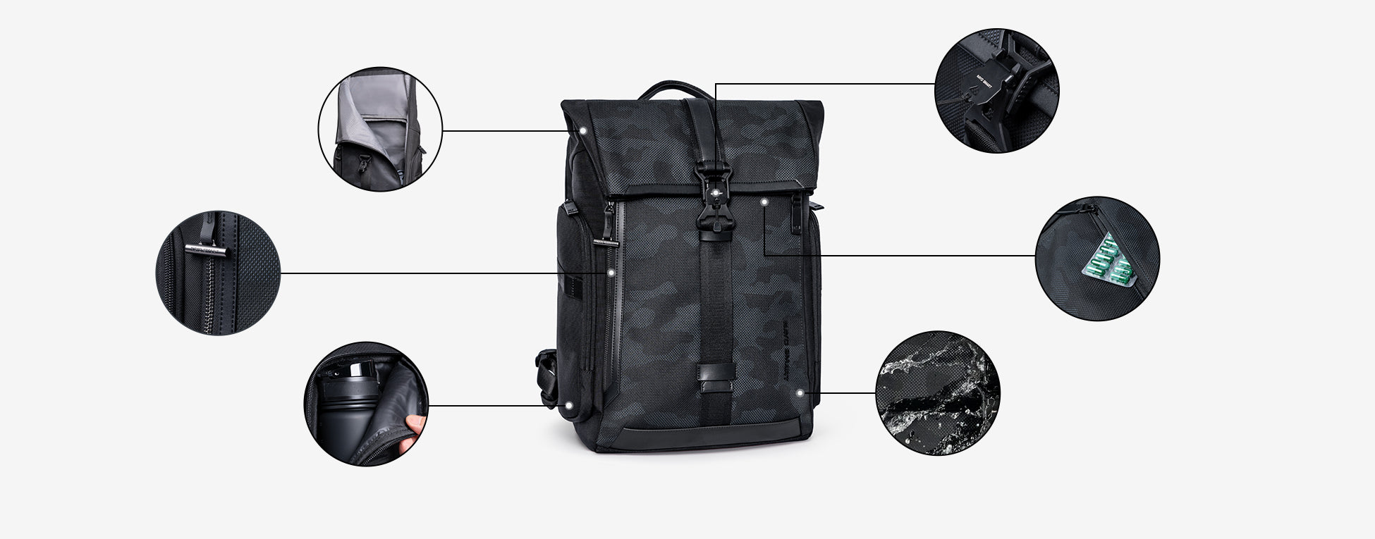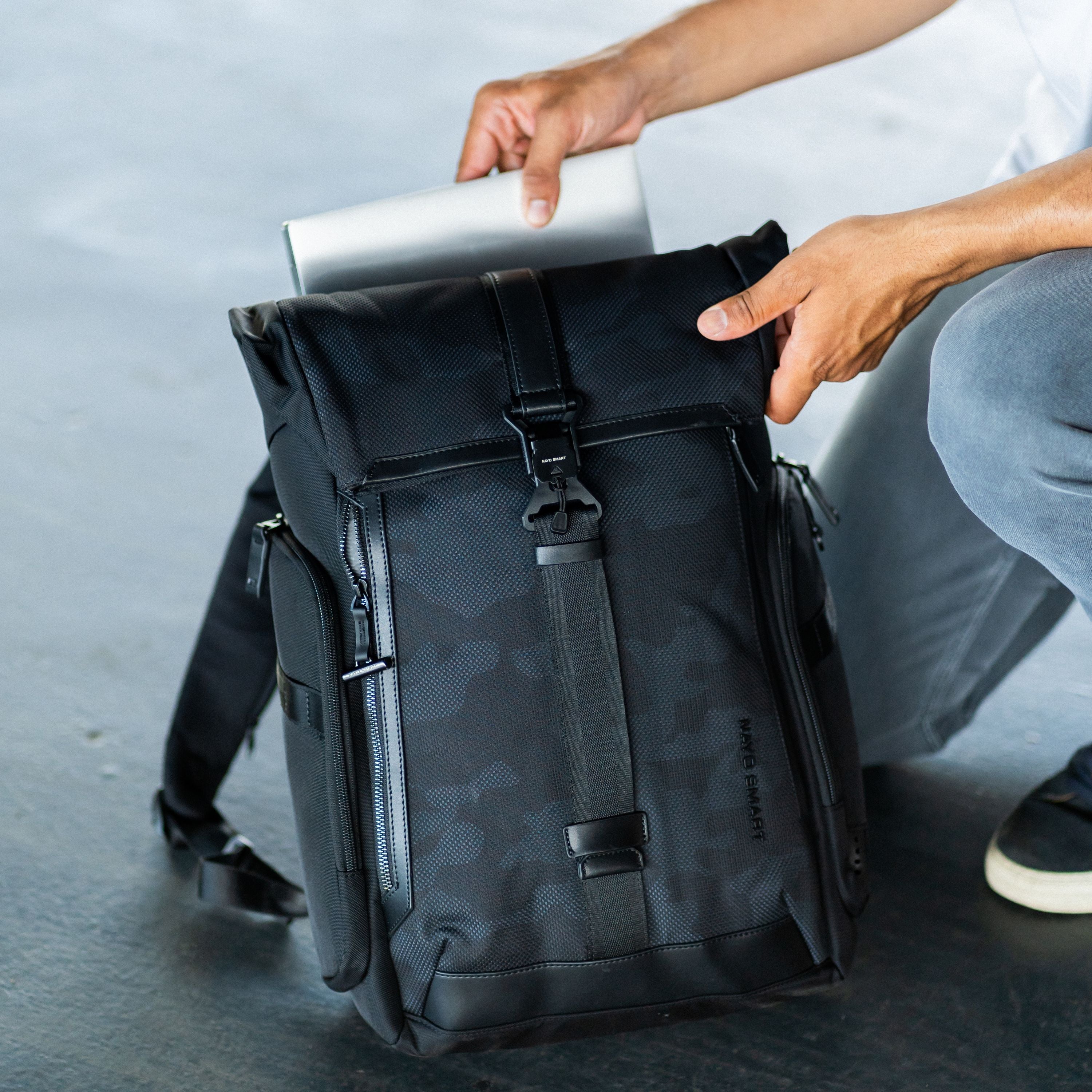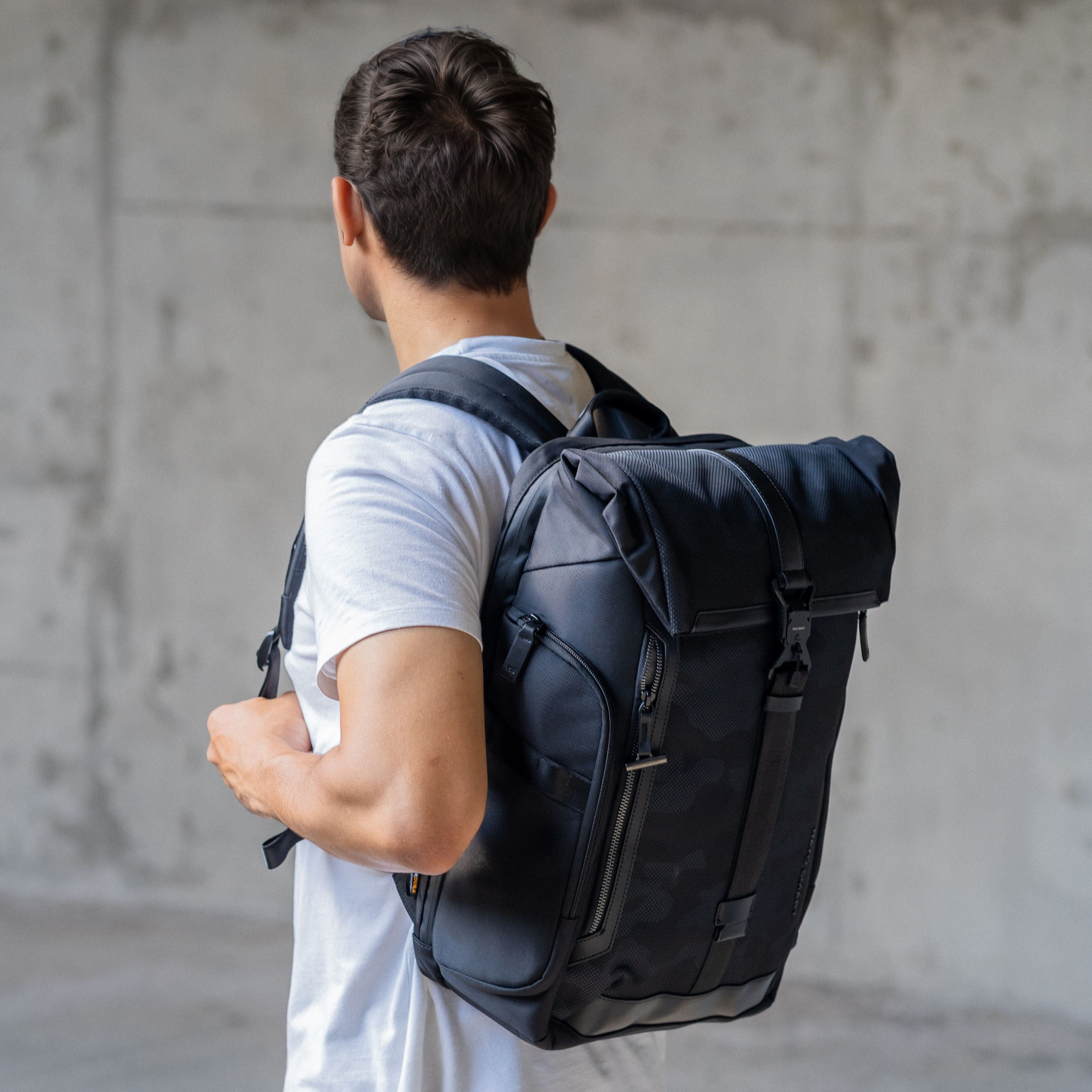 Features a partial-zipper closure complemented by military-grade magnetic buckles at the top center and sides. The roll-top design allows you to easily adjust capacity as needed.
