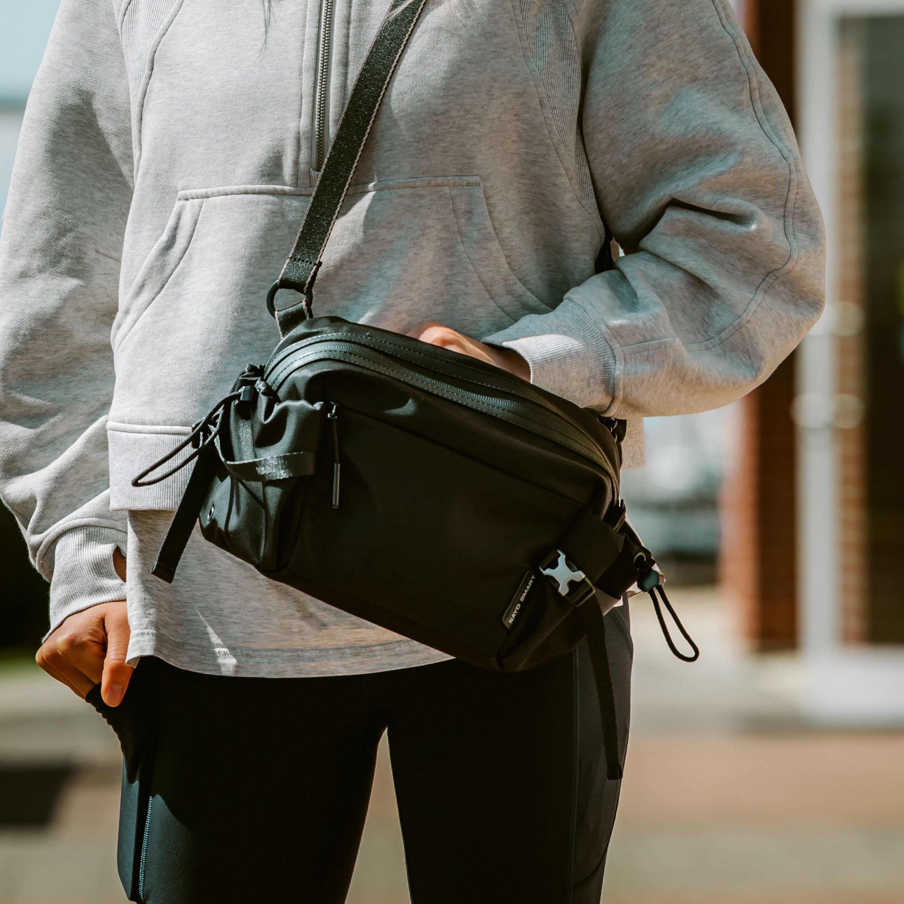 - Front quick-access zip pocket for hand sanitizer; hidden rear pocket for smartphone.