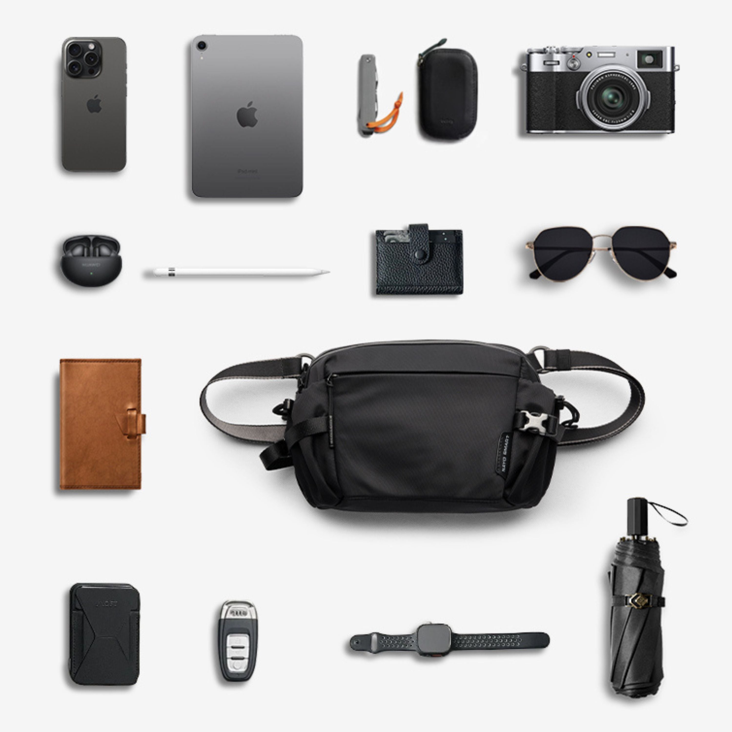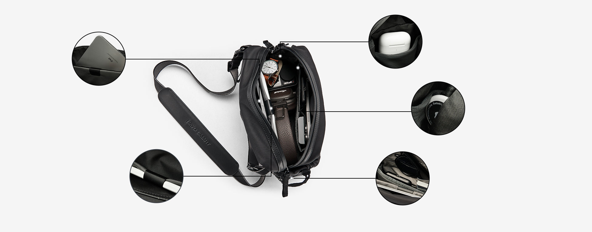 - Detachable shoulder strap doubles as a digital storage pouch.